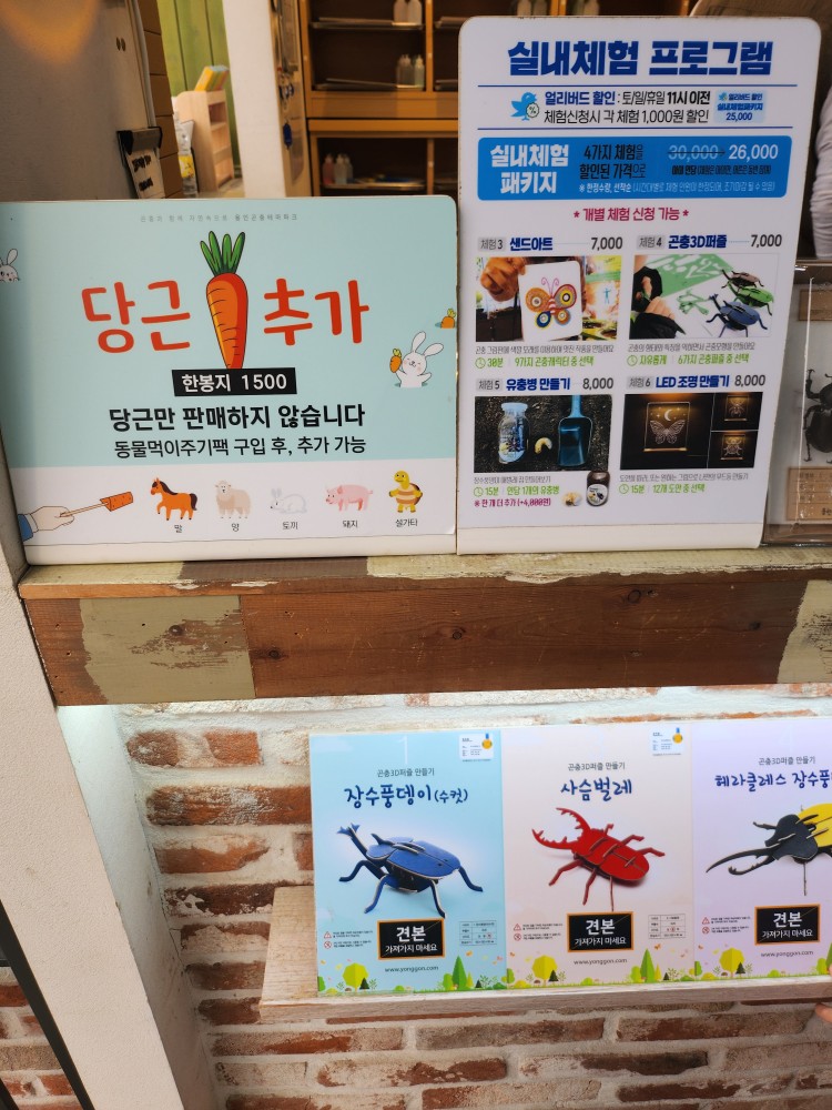곤충생태체험관에서는 먹이 주기 키트, 곤충 퍼즐, 만들기 세트 같은 걸 구입하고 만들어볼 수 있는 자리가 있어요. 저희는 예전에 퍼즐을 해봐서 이번에는 먹이주기 세트만 하나 구입했습니다.