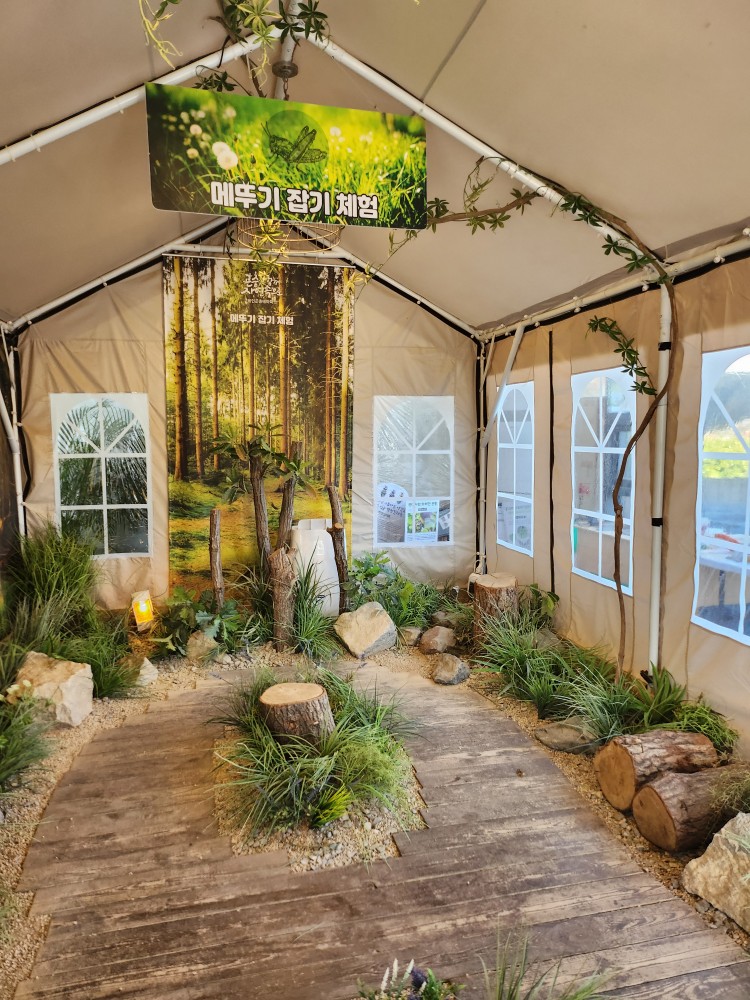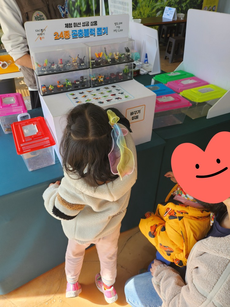 메뚜기 체험 코너에서는 메뚜기 잡기 체험을 할 수 있는데요. 보호자 1명당 아이 1명 들어갈 수 있었고, 5분 동안 열심히 메뚜기를 잡고 나오면 기념사진도 찍고 채집상자를 반납한 뒤 곤충 블럭을 뽑을 수 있게 안내해 주십니다. 저는 블럭은 바로 조립하지 말고 킵했다가 카페에서 쉬면서 하는 걸 추천드려요. 엄마 아빠가 음료 마실 시간을 벌어줍니다! 😎