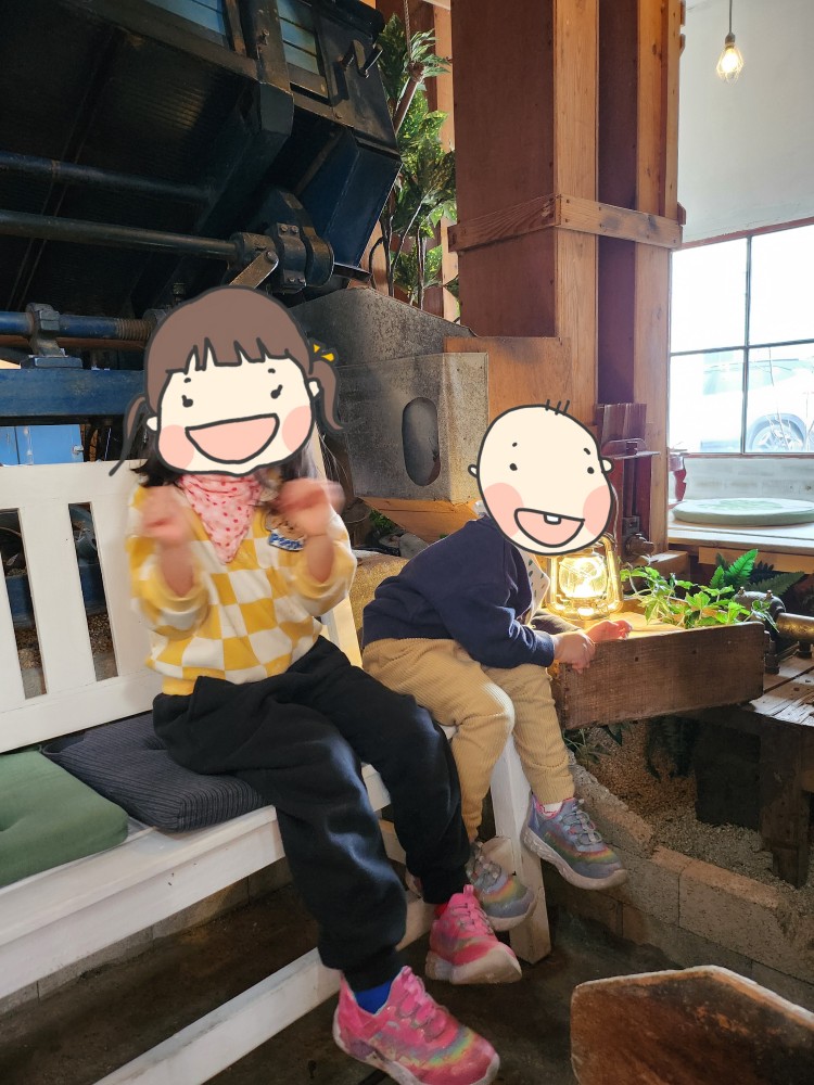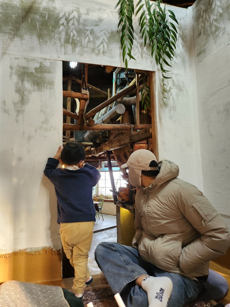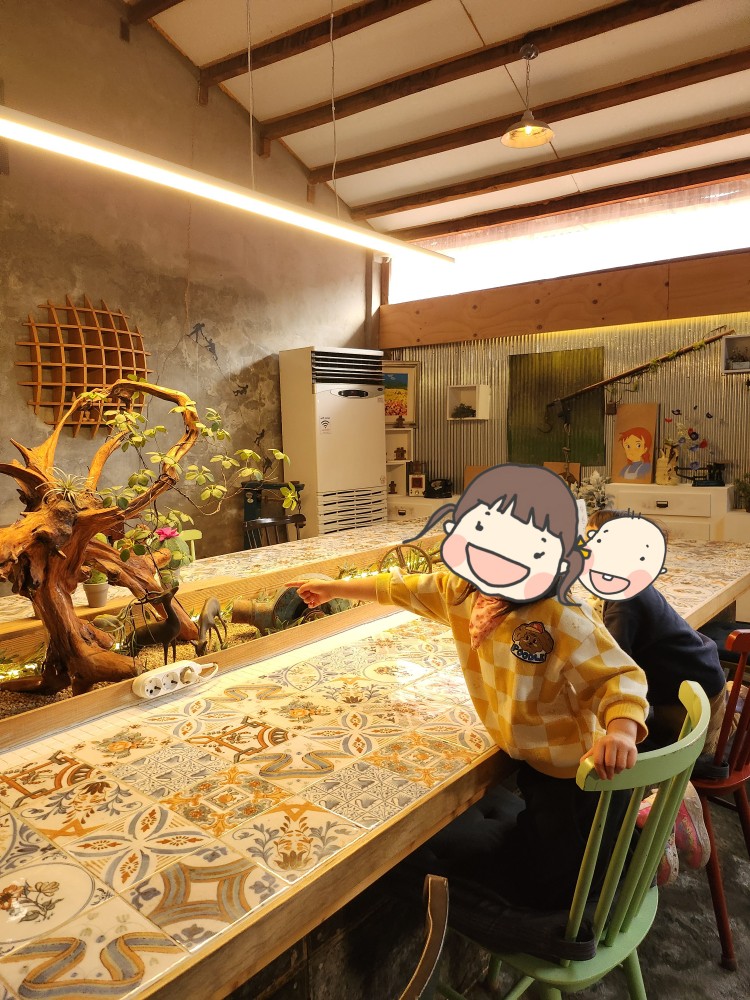 그래도 이 자리가 벽으로 둘러싸여있고 나름 저희끼리만 있을 수 있는 공간이라 그나마 아이들 데리고 앉기 가장 좋은 자리 같았습니다. 바닥이 살짝 경사가 있는데, 거기서 미끄럼을 타겠다고 어찌나 난리를 쳐대는지...😅 손님들이 별로 없긴 했지만... 너무 시끄럽게 굴어서 모험을 떠나자며 꼬셔서 카페 탐험을 시작했습니다. 조용히 미션을 수행(?)해야 친구들을 구할 수 있다면서 스토리를 진행시키자 애들이 정말 조용히 잘 따라오더라구요. ㅋㅋㅋ 추천드립니다.. 스토리텔링 기술이 좀 필요해요.. 😆