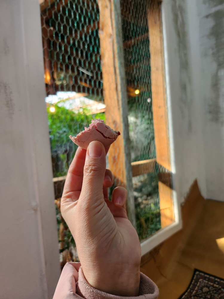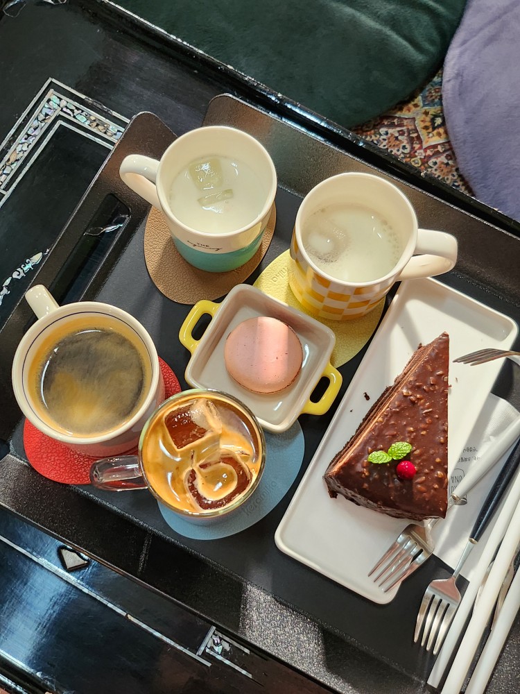 아이들은 딸기라떼 한 잔으로 둘이 나눠 마셨고, 어른들은 아메리카노 따뜻한 거 한 잔, 차가운 거 한 잔씩 시켰답니다. 애들이 초코케이크랑 마카롱 먹고 싶다 해서 하나씩 시켜줬구요! 음료는 무난했고, 케이크가 은근 헤이즐넛 향이 나면서 견과류도 씹히는 게 맛이 괜찮았어요. 애들은 그냥 물이나 줄걸 그랬어요. 시킨 음료는 먹지도 않더라구요..🥲🥲 아까운 딸기라떼!