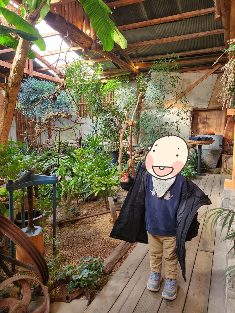 그래도 이 자리가 벽으로 둘러싸여있고 나름 저희끼리만 있을 수 있는 공간이라 그나마 아이들 데리고 앉기 가장 좋은 자리 같았습니다. 바닥이 살짝 경사가 있는데, 거기서 미끄럼을 타겠다고 어찌나 난리를 쳐대는지...😅 손님들이 별로 없긴 했지만... 너무 시끄럽게 굴어서 모험을 떠나자며 꼬셔서 카페 탐험을 시작했습니다. 조용히 미션을 수행(?)해야 친구들을 구할 수 있다면서 스토리를 진행시키자 애들이 정말 조용히 잘 따라오더라구요. ㅋㅋㅋ 추천드립니다.. 스토리텔링 기술이 좀 필요해요.. 😆