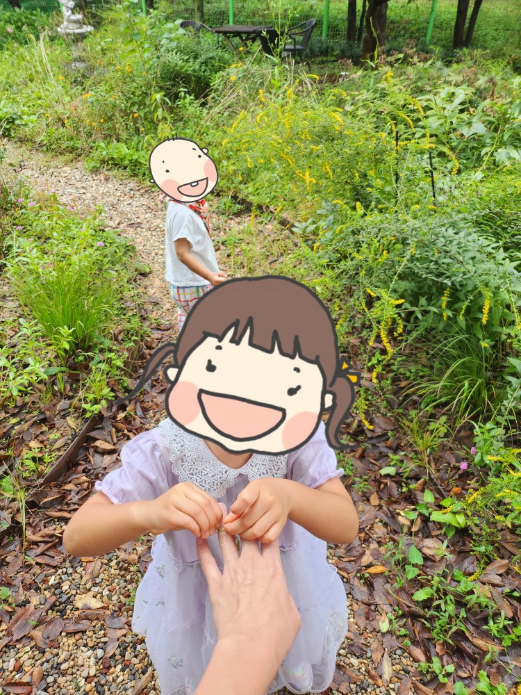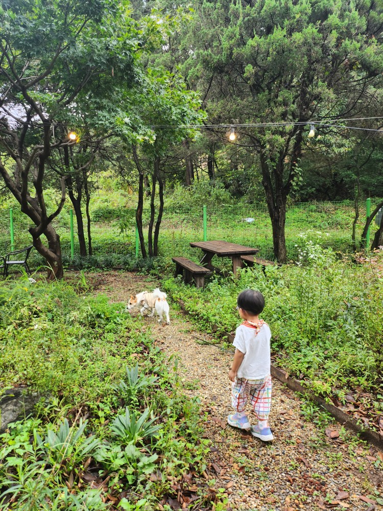 저희는 강아지와 아이들과 함께 뒤쪽 정원에서 놀았는데요! 찌아가 들풀로 반지도 만들어주고, 여기저기 자유롭게 돌아다니며 즐거운 시간을 가졌답니다!
