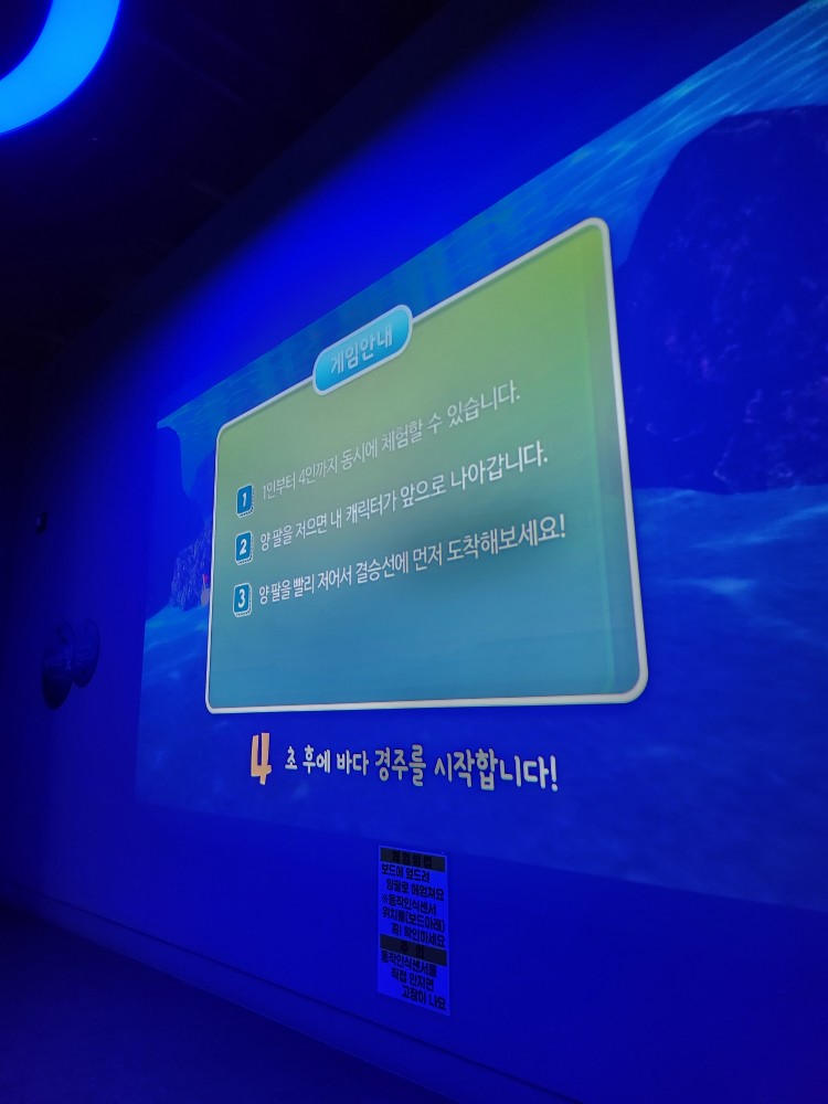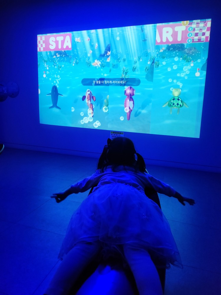 그리고 한쪽 구석에 수영..경주 게임이 있는데, 움직임 센서가 팔이 움직이는 걸 감지해서 경주를 할 수 있답니다. 저는 잘 안되는데 남편과 찌아는 잘 하더라구요. 생각보다 재미있어서 약간 땀이 날 정도로 가족 넷이서 열심히 경주를 했답니다! 😆😆