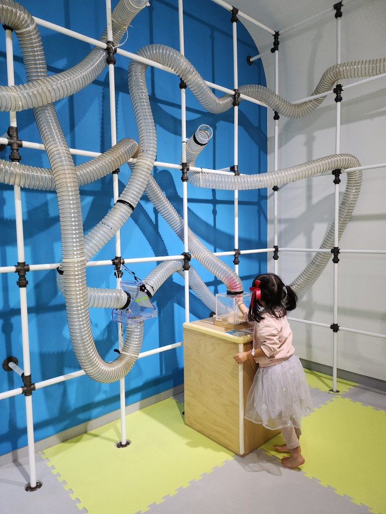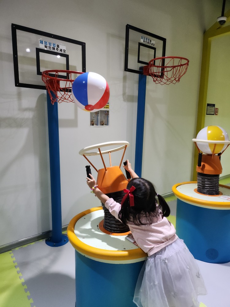 저 바람이 통하는 파이프에 천을 넣으면 슈웅~ 돌아다니다가 밖으로 튀어나오는?! 기구도 있었는데 이름을 모르겠네요. 별 것 아니어보이는데 아이들이 꺄르륵대며 너무 좋아했어요! 그리고 에어 농구?도 했는데 과천 과학관에서는 기계가 한개뿐이어서 줄을 서서 했었거든요. 근데 여기는 3-4개가 있고 사람도 많지 않아서 편하게 할 수 있었답니다! 🏀