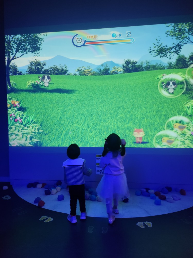오재미(?)를 던져서 비눗방울 속 동물들을 구해주거나, 칠교 블럭을 맞추고,