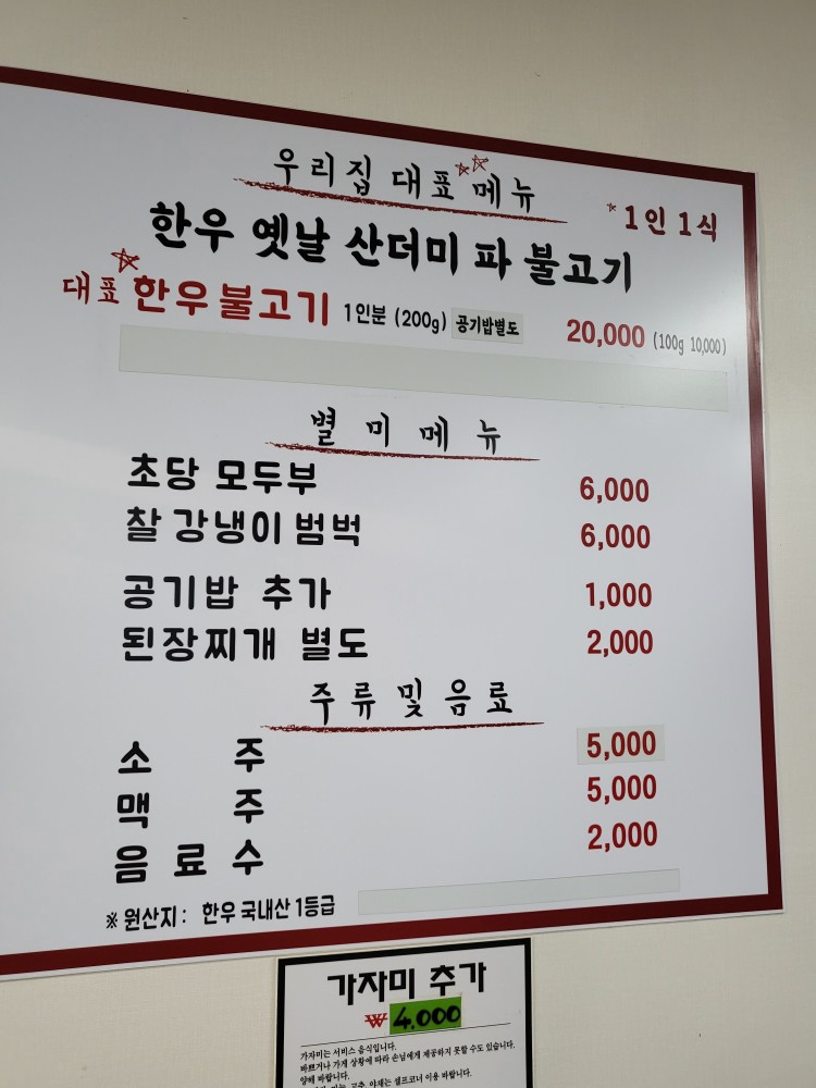 - 한우 옛날 산더미 파 불고기 1인분 (200g) : 20,000원