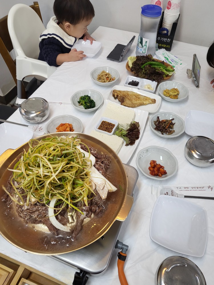삼척에서 생선 위주로 식사를 하다 보니 고기가 먹고 싶어 져서, 저녁 식사로는 강릉 불고기 삼척점에 들러보았습니다. 불고기 위에 올라가 있는 파절이에 고춧가루가 보여서 놀라서 여쭤보았는데, 아기와 함께 먹는 경우에는 고기만 먼저 익혀서 아기가 먹을 분량만큼 덜어주시고 어른들 먹을 불고기를 조리해 주시니 걱정 안 하셔도 됩니다. 아기들은 불고기와 밥을 같이 주었는데, 적당히 잘 먹었습니다. 아침, 점심때만큼 많이 먹지는 않았던 것 같아요. 고기는 한우치고는 그렇게 부드럽지는 않았지만 달큰짭짤한 불고기와 파절이를 함께 먹으니 조화로워서 맛있었습니다. 가자미도 역시 점심때 생선구이 전문점에 다녀와서 그런지 평범한 느낌이었습니다. 하지만 모두부가 고소하니 맛이 있었고, 반찬을 셀프로 가져다 먹을 수 있어서 편하게 먹을 수 있었습니다. 마늘장아찌와 불고기를 같이 먹으니 상큼해서 맛있더라고요!