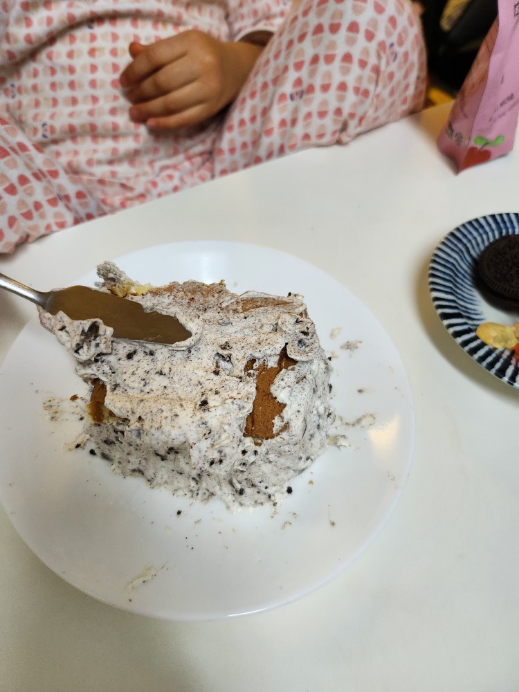 연령대가 있는 아이들이라면 모든 과정을 같이 진행해도 되지만 저희 집 만 3세, 만 2세는 잘 따라올 것 같지가 않아서 위의 사진처럼 준비를 해놓고 케이크 만들기 체험(?)을 진행했습니다. 결국 아이들은 맨 윗면에만 크림을 바르고 꾸며주기만 하는 셈이에요!