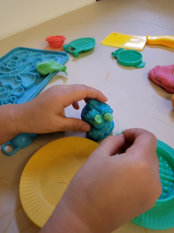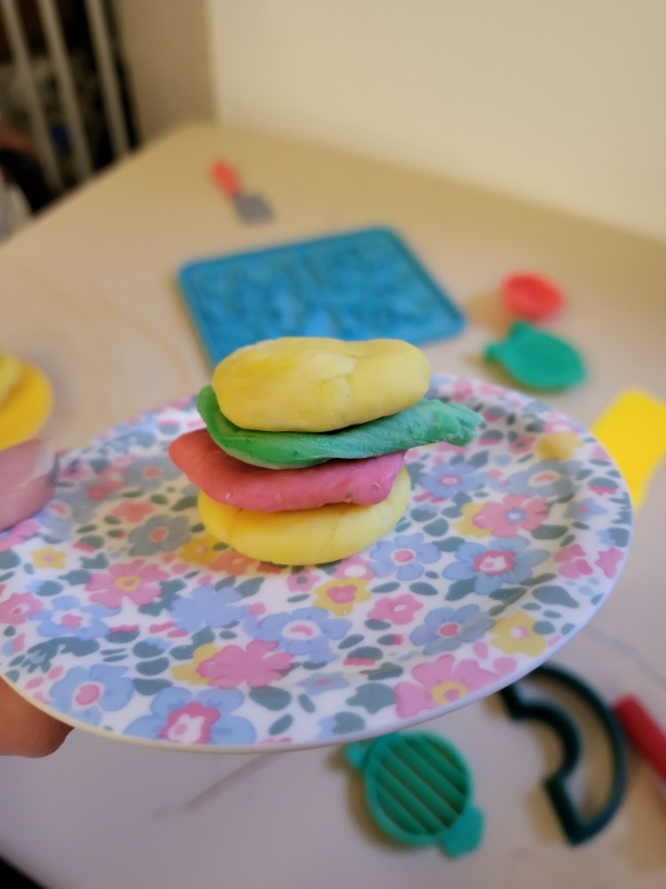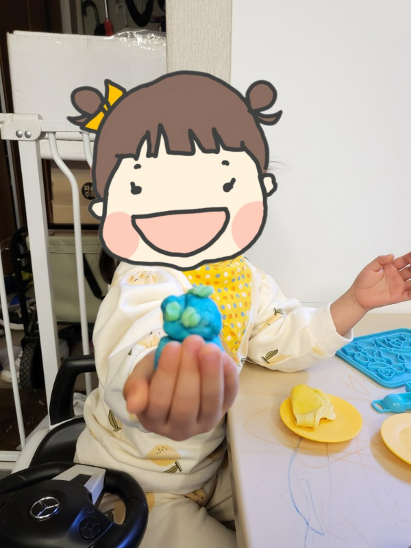 다 만들어진 반죽을 33개월 찌아, 19개월 쭈니에게 주니 둘이서 꽁냥꽁냥 재미있게 노네요. 찌아는 파란 밀가루 점토로 눈사람도 만들어보고, 엄마에게 햄버거를 만들어달라고 해서 햄버거 가게 놀이도 했습니다. 밀가루 점토를 길게 늘여서 팔찌와 목걸이도 만들어서 공주님도 되어보구요. 밀가루 점토 하나면 이것저것 만들면서 신나게 놀 수 있어서 정말 좋습니다. 19개월 쭈니는 촉감놀이정도 느낌으로 누나 옆에서 점토를 만지작거리거나 장난감 칼로 잘라보며 놀 수 있었습니다. 확실히 연령대에 따라서 같은 놀이라도 즐기는 모습이 달라서 신기하네요! 하지만 19개월, 33개월 아기 둘 다 엄마표 밀가루 점토놀이를 좋아해 주었습니다!