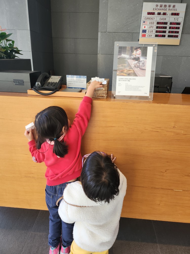 체크인 데스크 한켠에 물고기 먹이가 놓여 있어서 가져다가 주면 됩니다. 애들이 너무 좋아해서 바닥에 엎드려서 먹이 주고 물고기 쳐다보고.. 엄청 즐거운 시간을 보냈어요!