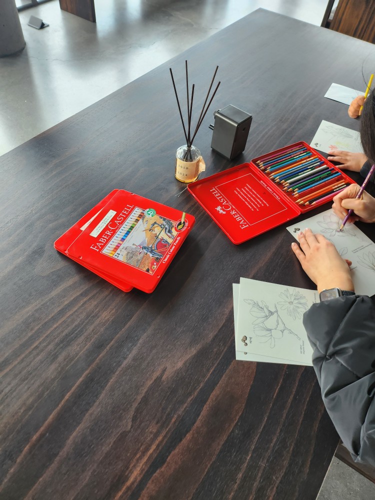 안에는 컬러링 체험을 할 수 있는 공간도 있었어요. 다른 체험도 있는 것 같긴 한데, 저희는 컬러링만 하고 왔답니다 🎨 전체적으로 통창으로 되어 있어서 너무 아름다워요! 이곳에 컬러링을 위해 사용할 종이, 색연필 등의 도구들이 준비되어 있습니다!