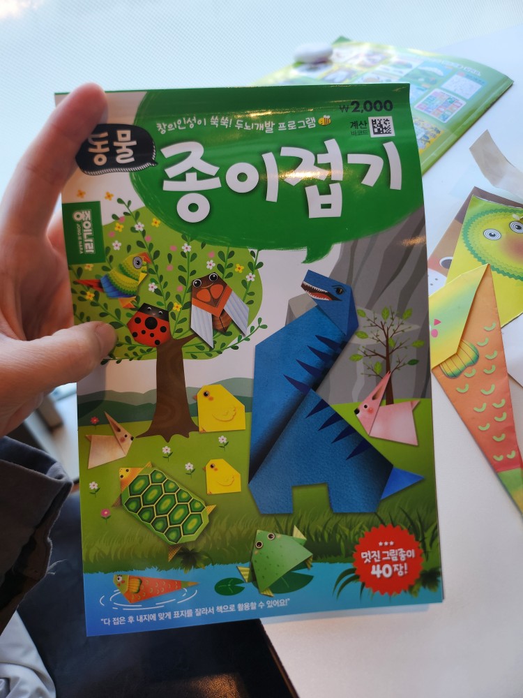 여러 가지 동물, 곤충들을 종이로 접을 수 있게 되어 있는 종이접기 책이었어요. 만드는 방법을 보고 종이를 오려서 그대로 접어주면 됩니다. 이건 약간 어른의 도움이 필요하지만, 개구리도 만들고 강아지도 만들고 하면서 즐거워했어요!