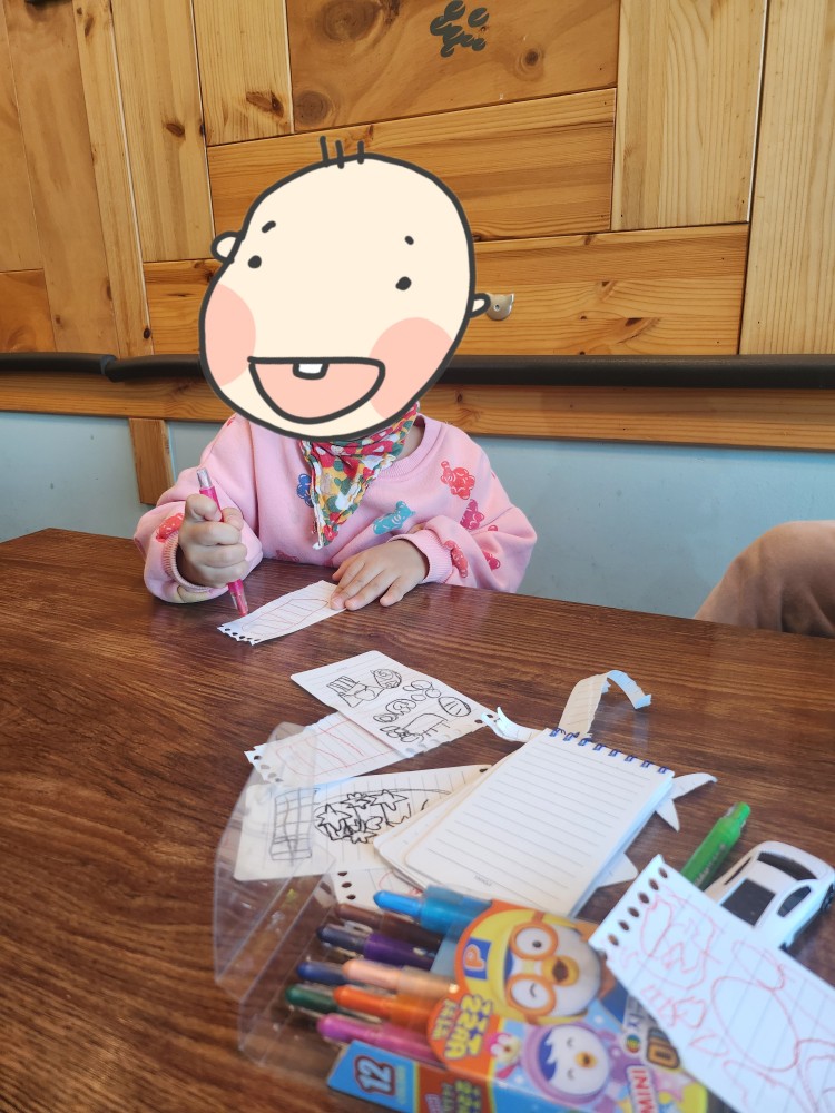 약간 이른 시간에 저녁을 먹으러 와서 그런지, 저희가 들어왔을때는 사람이 없었답니다. 테이블도 넓어서 아이들이 수첩에 그림을 그리며 시간을 보내기 좋았어요!