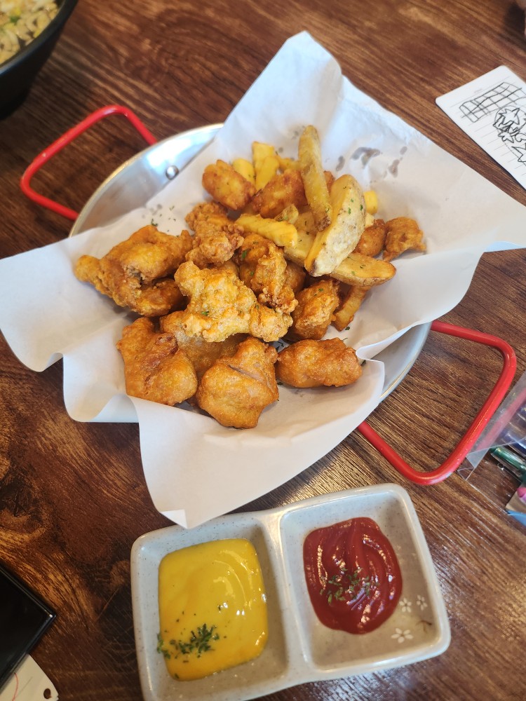 - 순살치킨+감자튀김: 이건 시판 냉동 가라아게랑 감자튀김 튀겨먹는 맛이랑 비슷했어요. 무난했지만 굳이 또 사먹지는 않을 듯 합니다.