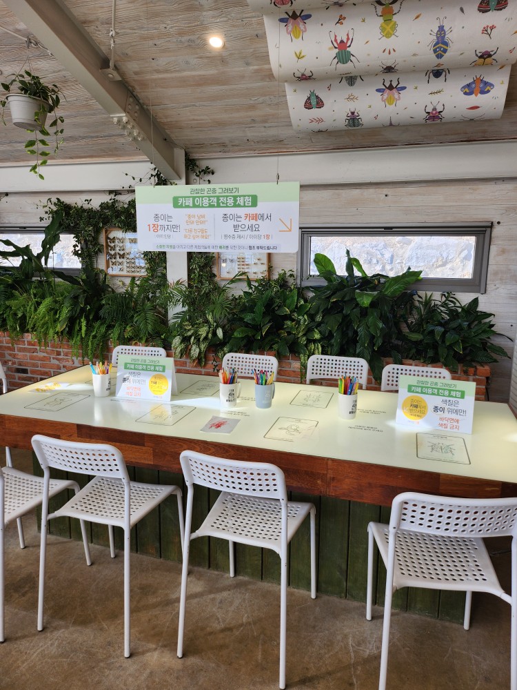 음료를 주문하면서 그림 그릴 종이를 요청하세요! 2층에 그림 그리는 곳이 있는데 바닥에 그려진 밑그림 위에 종이를 고정시키고 따라 그린 뒤 색칠하는 형태라, 카페에서 제공해주는 포스트잇 스타일 종이가 필요합니다! 저희는 캐릭터 주스 두 개 주문하면서 종이 두 장도 받아서 2층으로 올라갔습니다.