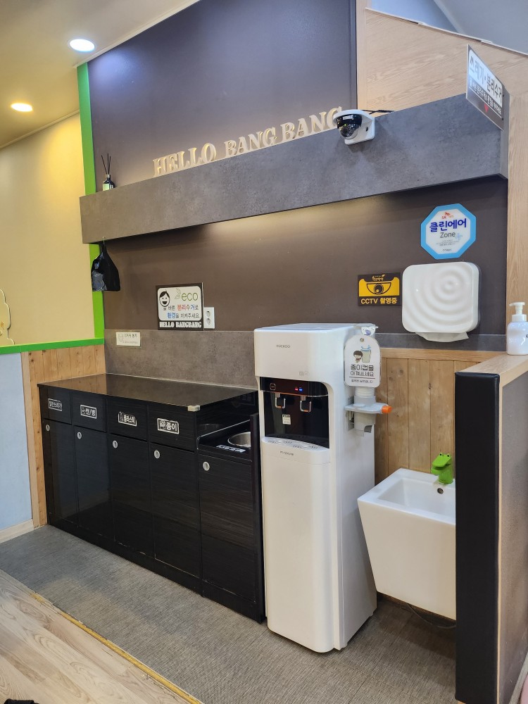 앉아서 차 마시거나 식사할 수 있는 테이블 자리도 있구요. 여기서 엄마들이랑 수다도 떨고, 차 마시고, 애들 저녁도 먹이고 하면서 즐거운 시간을 보냈습니다. 앞에 CCTV도 있는데 화면이 작아서 애들 구분이 잘 되진 않아서, 쨍한 색 옷 입혀놓으면 좋을 것 같아요. CCTV가 있다는 것만으로도 저는 마음이 좀 놓이더라구요. 정수기랑 휴지통도 한쪽에 있어서 물 떠주기 편했습니다.