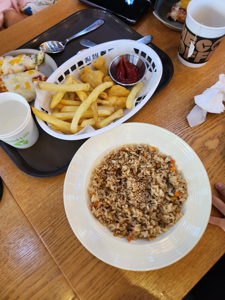 저희는 볶음밥 2개, 너겟과 감자튀김 2개, 피자 1개를 시켜서 어른들은 피자 한쪽씩 먹고, 나머지는 아이들 5명이서 나눠먹었어요. 치즈피자가 맛있었고, 볶음밥은 어린이용이라 그런지 슴슴해서 오히려 좋더라구요!