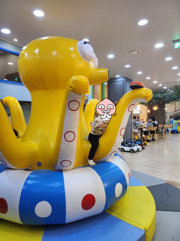 들어가자마자 거대한(?) 돌아가는 문어가 보이는데, 애들이 계산하기 전부터 문어한테 달려갑니다 ㅋㅋ 6세 찌아는 엄마도 없이 암벽등반으로 거의 위까지 올라가버리고, 저는 심장이 철렁했어요. 처음부터 에너지 폭발입니다.