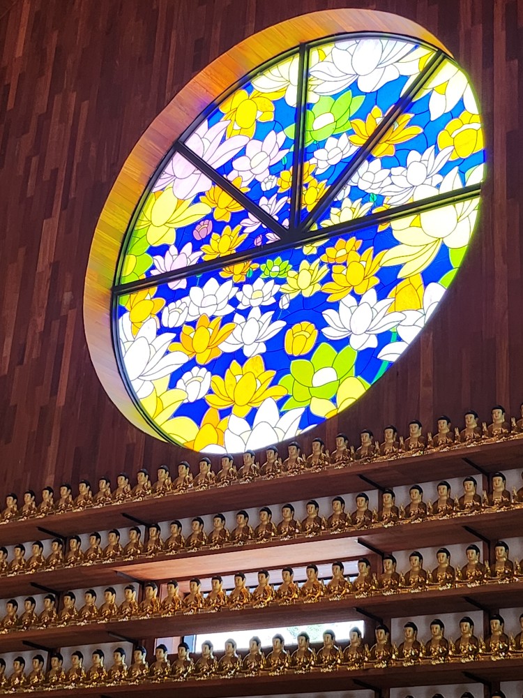 옆으로 누워 있는 불상이 있는 공간도 볼 수 있었는데, 건물 유리창이 스테인드글라스처럼 예쁘게 되어 있어서 정말 인상적이었어요. 섬세하고 예뻐서 잠깐 멈춰서 보게 되더라구요.