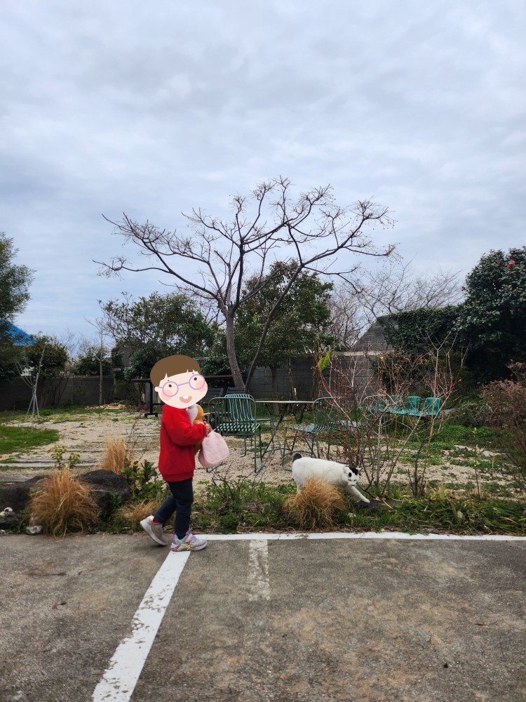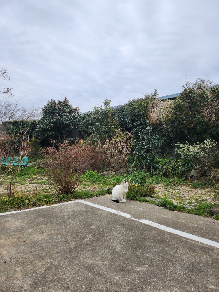 정원에서 귤나무 앞에서 사진도 찍고, 고양이도 만날 수 있었습니다. 착하고 귀여운 하얀 고양이였어요! 저희가 좀 가까이 다가가도 막 도망가지 않는 걸 보니 사람을 좋아하는(?) 친구 아닐까 싶습니다! 귀여웡...🥰🥰