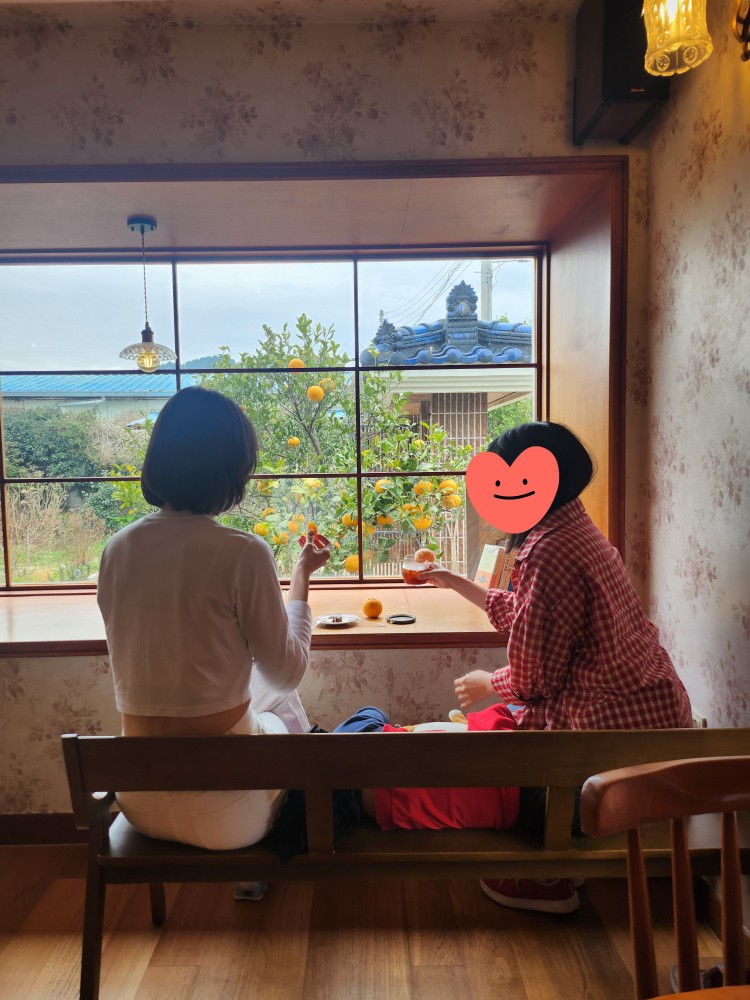 저랑 친구 둘 다 뷰 좋은 데에서 시간 보내는 걸 정말 좋아하는데요. 귤나무를 바로 앞에 두고 티타임을 가지니까 “좋다 좋다~~” 이 말을 한 200번은 한 것 같아요 ㅋㅋ 사장님이 중간에 노지 한라봉도 하나씩 주셨는데, 평소 먹던 것보다 새콤한 맛이 강하긴 했지만 맛있었어요. 서비스로 한라봉을 주시다니 여기가 바로 제주도로구만~~~ 하는 생각이 들었답니다. ㅋㅋㅋ 😆