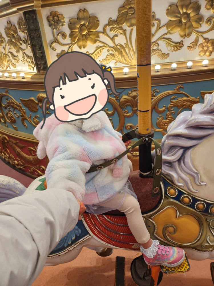 회전목마는 100cm 안 되는 친구들은 보호자와 함께 타야해요! 첫째는 제 옆에서 혼자 말 타고, 둘째 쭈니는 남편과 마차 타고 신나했답니다. 애들은 회전목마도 재밌어해요! 🤣