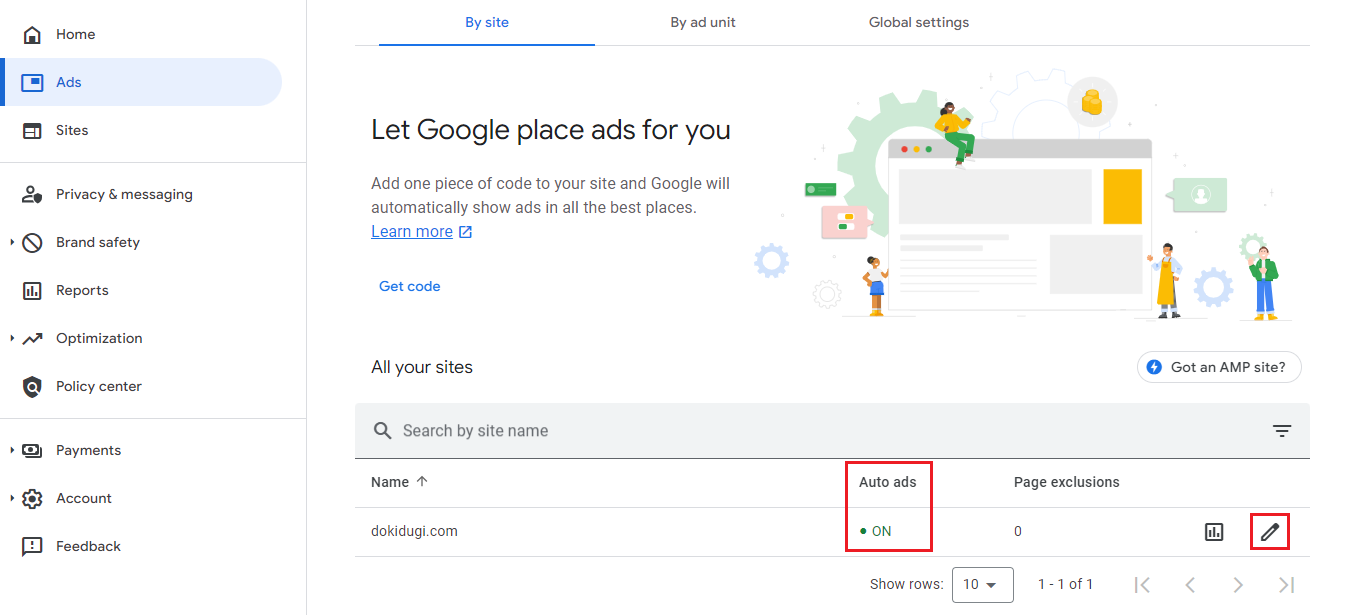 Auto ads(자동 광고)가 on(사용) 상태가 아니라면 우측 편집 아이콘을 클릭하여 자동 광고 설정을 해줍니다.