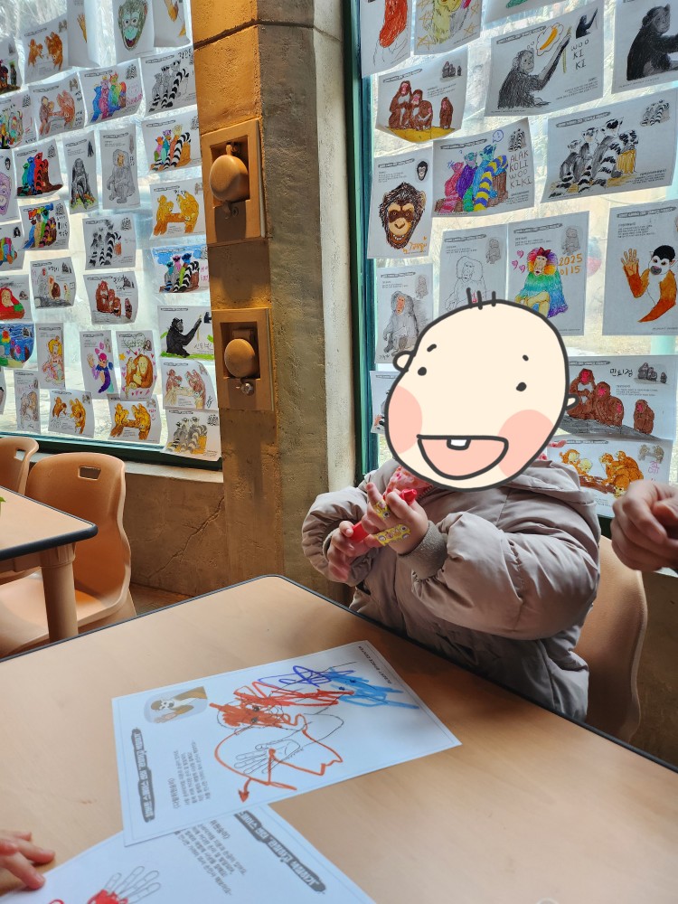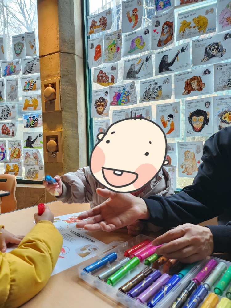 관찰하는 것만으로 끝이 아니라, 아이들이 직접 참여할 수 있는 활동 있는데요. 색칠놀이 코너가 있어요. 아이들이 동물 도안을 직접 색칠하면서 즐거워했답니다. 찌아 쭈니도 여기서 한참을 앉아서 집중하더라구요! 색칠을 끝내면 뱃지를 받을 수 있으니 직원분께 문의하세요!