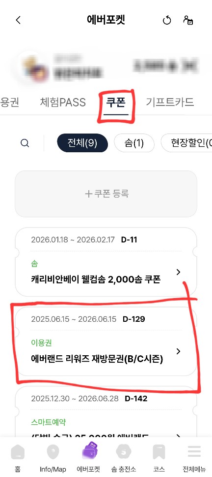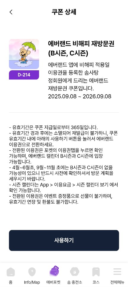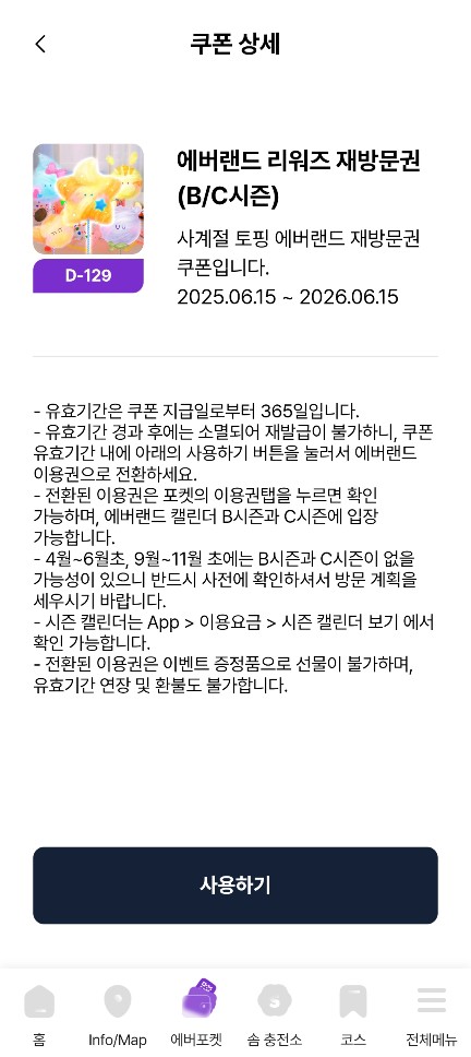 일단 에버랜드 앱에서 에버포켓 > 쿠폰에 들어가서 재방문권이 있는지 확인해봅니다.