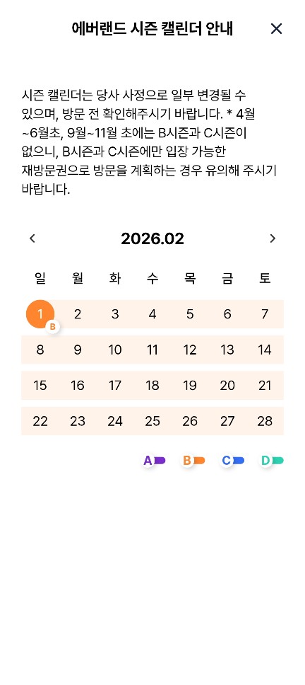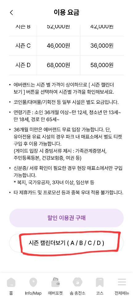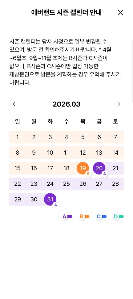 앱에서 B/C 시즌이 언제인지 확인해봤습니다! 에버랜드 앱에 접속해서 전체메뉴 > 이용요금 > 시즌 캘린더보기 (A/B/C/D) 를 하면 확인이 가능합니다.