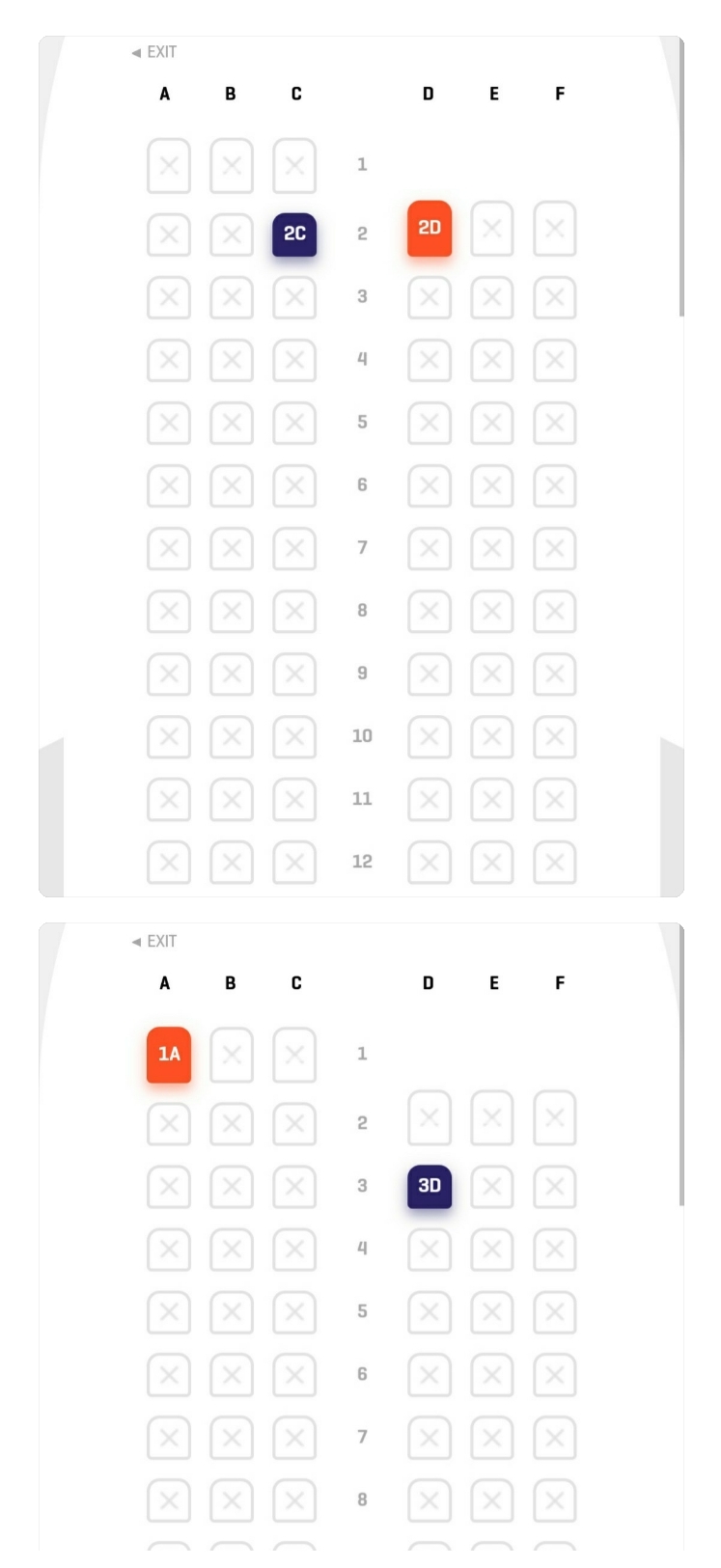 밤비행기는 낮비행기보다 저렴했는데, 남편은 밤비행기가 더 힘들 것 같다고 했다. 아기들 좌석이 없기 때문에 안고 가야 하는데 첫째가 안겨서 잘 자지도 않을 것 같고, 차라리 놀아주며 가는 게 나을 것 같다는 것이었다. 이 부분은 내가 둘째를 안고 가고, 남편이 첫째를 안고 갈 것이기 때문에 남편의 의견을 존중하기로 했다. 둘째는 낮이든 밤이든 상관이 별로 없을 것 같았기 때문에 문제 되는 것은 첫째 케어와 항공료였다. 밤비행기는 넷이 100만 원 정도, 낮비행기는 넷이 좌석구매까지 포함해서 130만 원 정도로 30만 원 정도가 차이 났지만 낮비행기로 가기로 했다. 저렴하게 가는 게 아닌 것 같지만... 가기로 한 김에 가는데 의의를 두는 걸로... 아래는 우리가 예약해 둔 좌석이다. 세 자리씩 나뉘어있는데 같은 줄에는 아기 동반이 한 명씩만 가능해서 이렇게 자리를 잡아봤다.