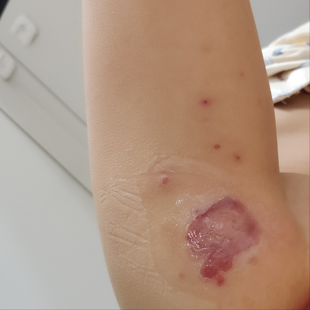 👉 농가진 초기~중기 진입 시점 (긁은 상처 + 습한 기저귀 환경 → 세균 증식)