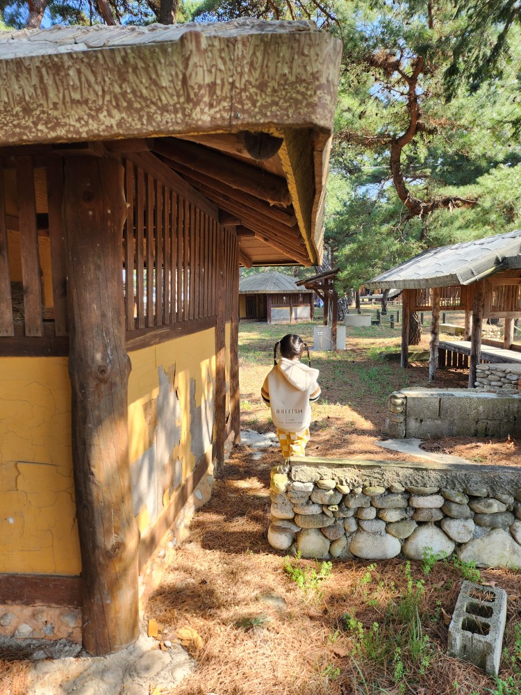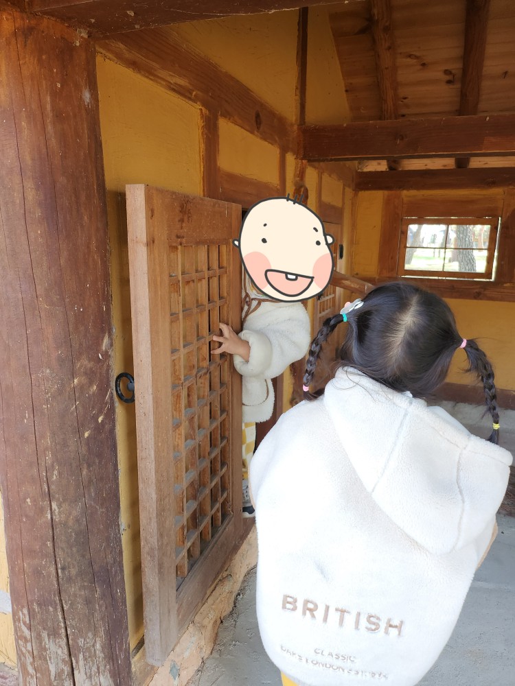 숲 놀이터 뒤쪽으로는 자그마한 마을이 꾸며져 있어요. 아이들 사이즈에 딱이어서 찌아 쭈니가 너무 즐거워했답니다. 이곳저곳 들어가 보고 문도 열어보고 하며 즐거운 시간을 보냈어요!