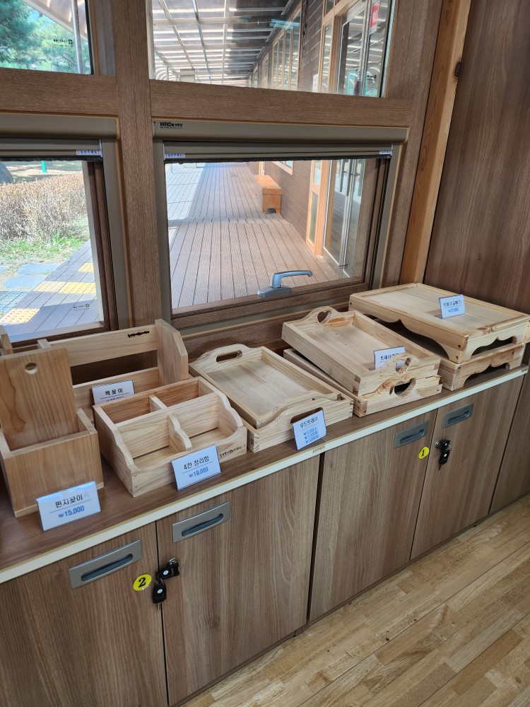 작업대도 넉넉히 준비되어있고, 만들 수 있는 체험 키트도 다양하게 준비되어 있었습니다.찌아 쭈니처럼 어린아이들은 색칠하는 정도의 체험도 가능하다고 하네요! 저희는 숲 놀이터와 실내 공간에서 시간을 많이 보내서 목공 체험을 해보지는 않고 둘러보기만 했는데요! 체험 키트마다 가격이 다르고, 만들어서 가져가는 것과 그냥 사서 가는 것이 가격이 같다고 설명을 들었습니다!