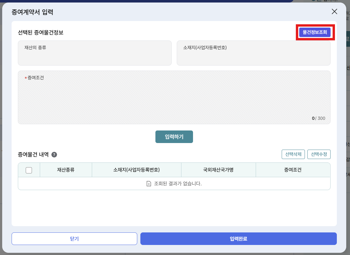 증여물건 내역 부분에 해당 내용이 추가됩니다. 추가된 내용을 확인 후 입력완료 버튼을 누릅니다.