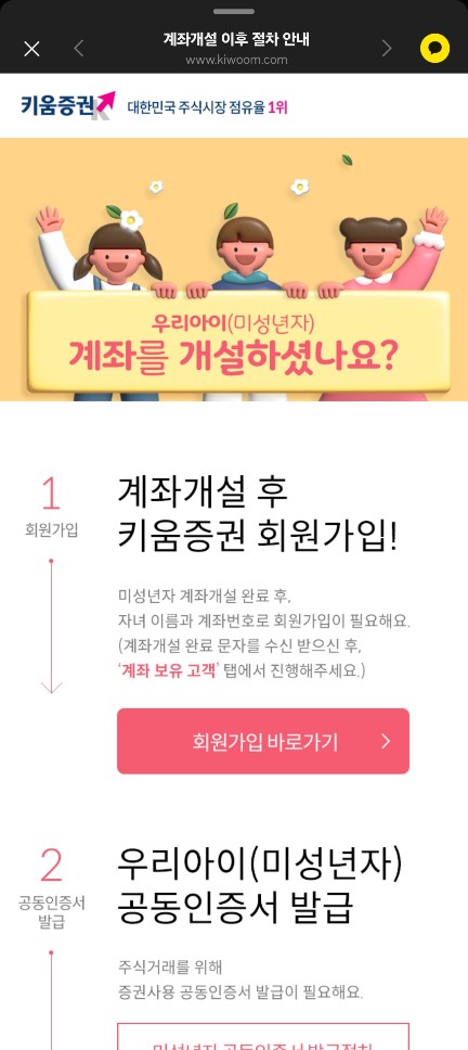 키움 증권에서 자녀 주식 계좌 비대면 개설을 하고 나면 카톡으로 개좌개설 이후 절차 안내 메시지가 옵니다. 그걸 그대로 따라하면 되는데, 그 중 안되는 부분이 있어서 내용 공유합니다! 자세한 내용은 아래에 적을게요!