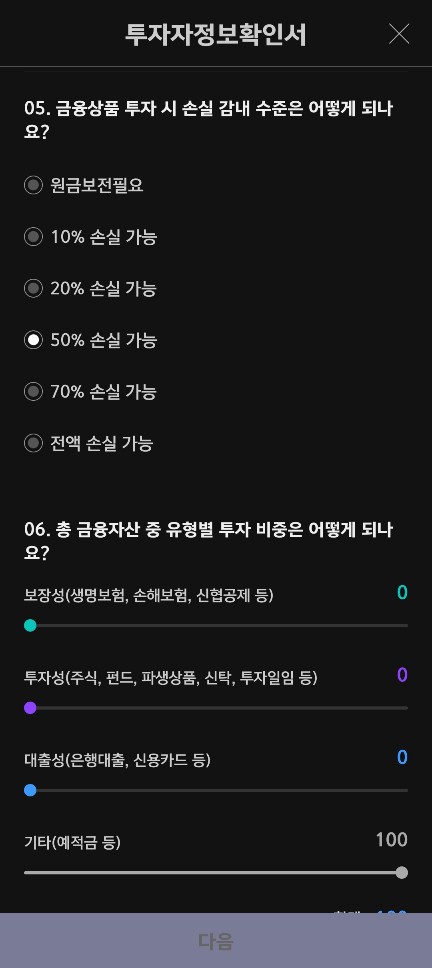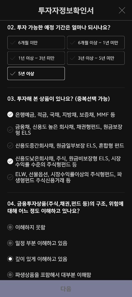 연금계좌를 등록하고 나면 자동으로 투자자정보확인서 작성이 떴던 것 같은데.. 위의 캡처와 같이 입력해서 적극투자형을 받아놨어요! 아이들 계좌로 엄청.. 고위험 종목을 하진 않을테니 저 정도만 해둬도 될 것 같네요!
