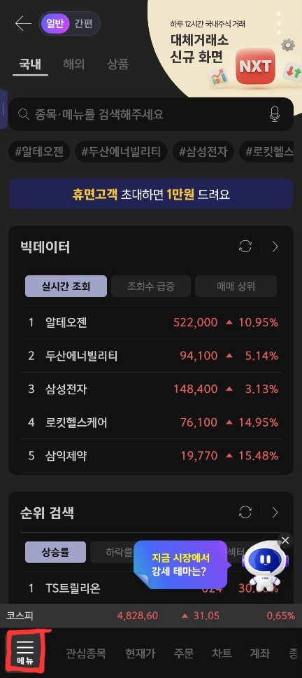 영웅문S 앱에서 자녀 명의의 공동인증서로 로그인을 한 후, 메뉴 > 계좌개설 버튼을 클릭해줍니다.