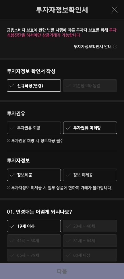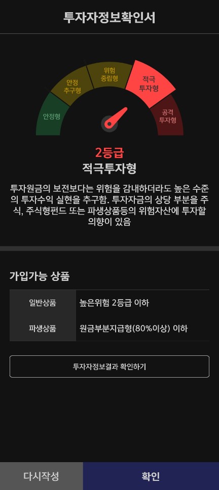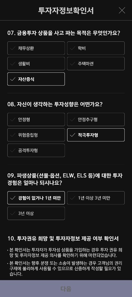 연금계좌를 등록하고 나면 자동으로 투자자정보확인서 작성이 떴던 것 같은데.. 위의 캡처와 같이 입력해서 적극투자형을 받아놨어요! 아이들 계좌로 엄청.. 고위험 종목을 하진 않을테니 저 정도만 해둬도 될 것 같네요!