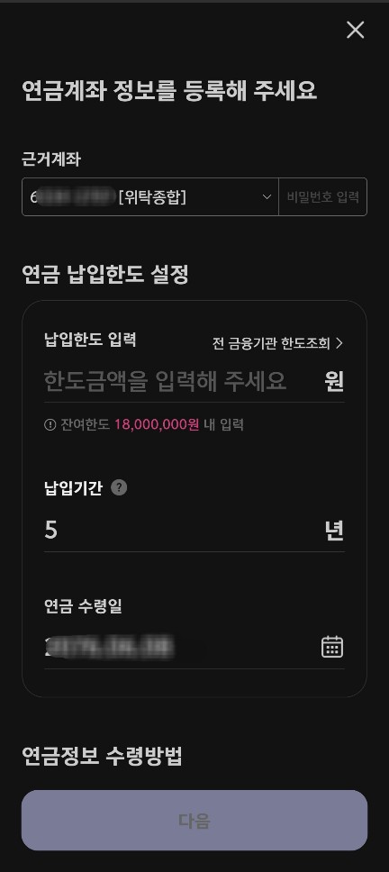동의할 것 동의해주고, 납입한도는 1800만원, 납입기간은 5년으로 해줬습니다.