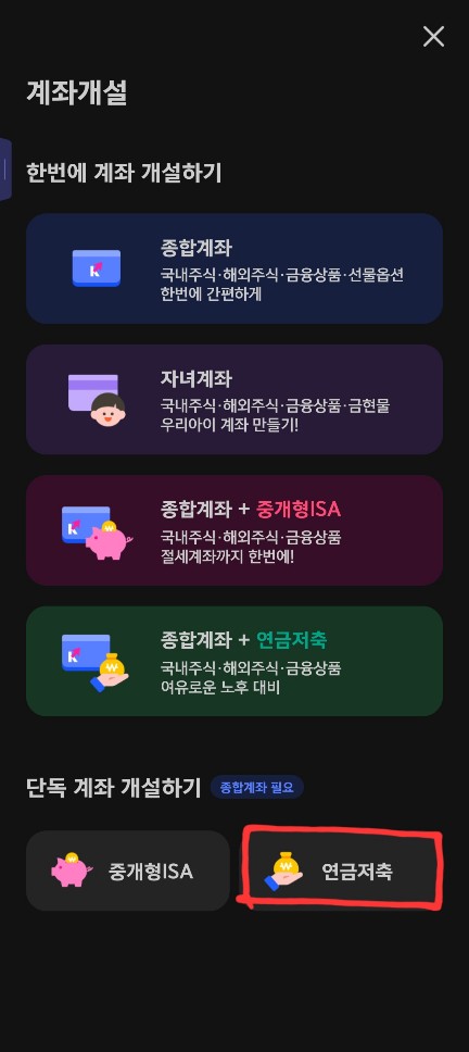 단독 계좌 개설하기 > 연금저축을 클릭 후 신규로 개설하기를 선택하여 진행해줍니다.