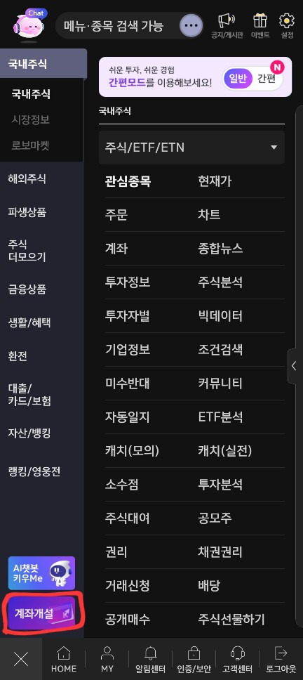 영웅문S 앱에서 자녀 명의의 공동인증서로 로그인을 한 후, 메뉴 > 계좌개설 버튼을 클릭해줍니다.