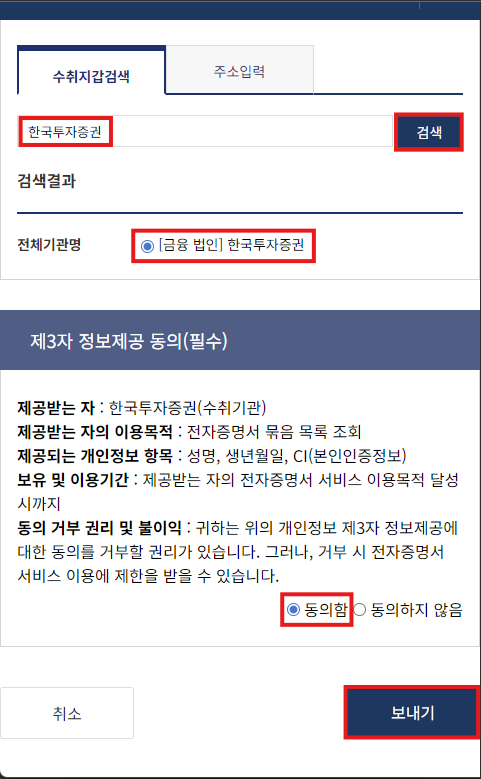 내보낼 서류를 체크하고 보내기 버튼을 누른 후, 한국투자증권에 보내면 됩니다.