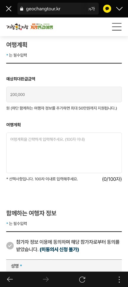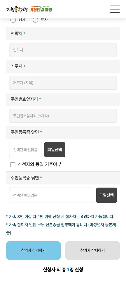 함께하는 여행자 정보를 넣어줍니다. 일행 중 성인은 주민등록등 앞, 뒷면, 미성년자는 등본을 첨부합니다.
