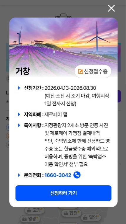 링크 접속해서 원하는 지역 클릭해서 [신청하러 가기] 버튼을 눌러서 신청 화면으로 진입해줍니다. 저는 거창이니까 거창 클릭! 그리고 오픈 일정은 일단 캘박해놓고.. 가끔 사이트 들어가서 일정 다시 확인 하는 걸 추천 드립니다! 잘못 게시되어 있거나, 일정이 슬쩍 바뀌어 있는 경우도 종종 있더라구요...ㅎㅎ;